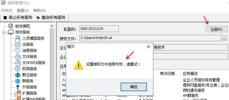 1、在注冊的時(shí)候,出現(xiàn)《設(shè)置授權(quán)文件信息失敗,請重試!》