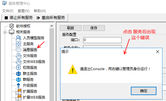 2、點(diǎn)擊服務(wù)的時(shí)候,出現(xiàn)《請退出Console,用右鍵以管理員身份運(yùn)行》