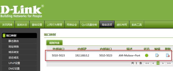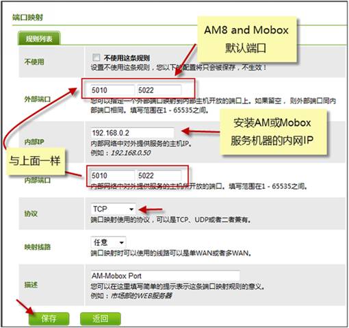 將Mobox企業云盤相關服務所用到的端口(默認是 5010~5022)進行端口映射設置,若自己與改過Mobox服務端的端口,則按實際的端口配置 (AM即時通的端口也是一樣的)